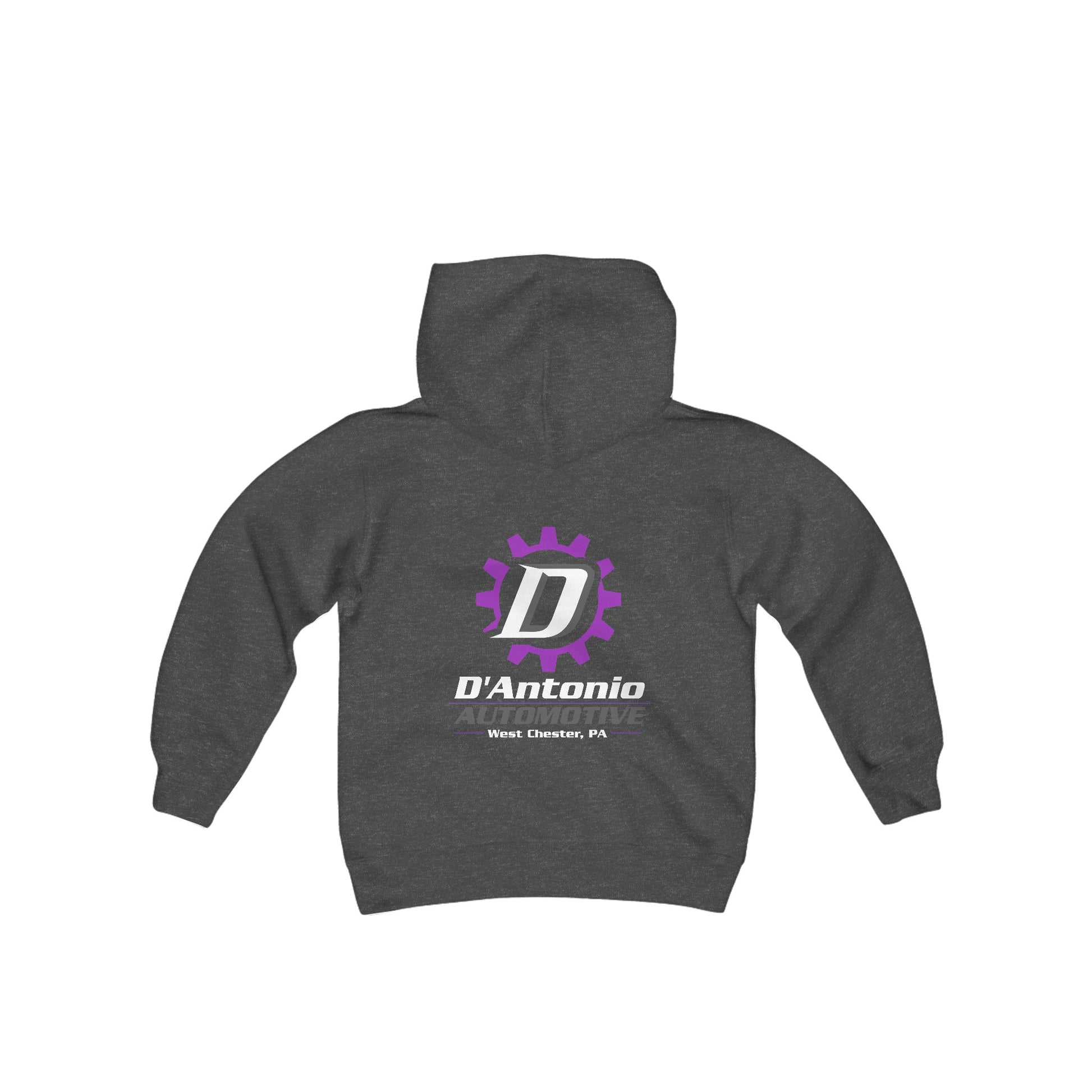 The D'Antonio Auto kids hoodie is made of ultra-soft, preshrunk fleece that feels wonderful against the skin. The garment is 50% cotton 50% polyester with reduced lint buildup. This makes an excellent combination for printing. The front has a kangaroo pocket big enough for both hands. The neck is reinforced with twill taping.